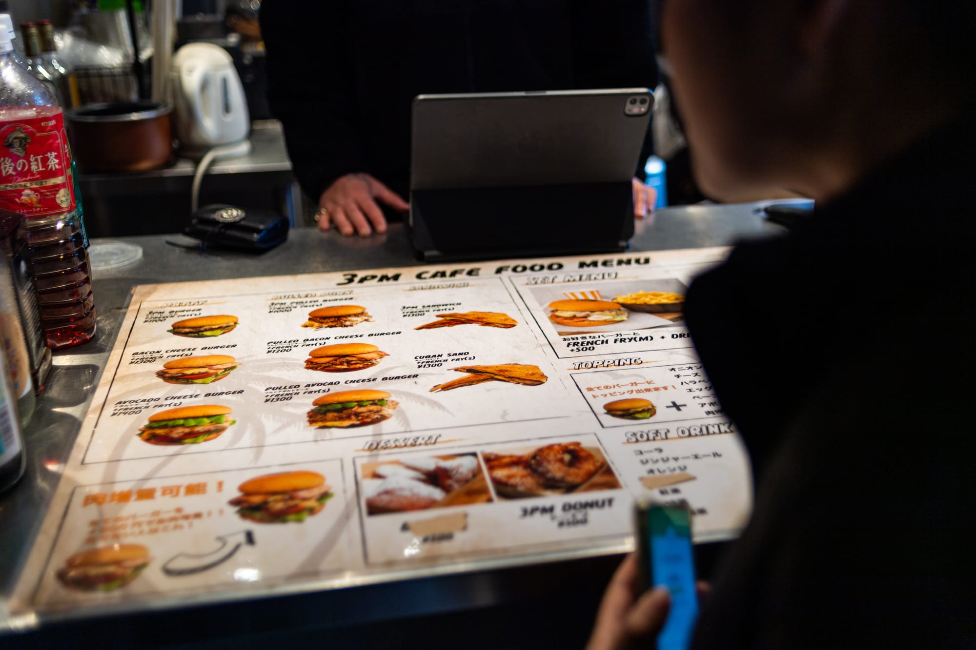 Once the owner finished his preparations, we descended to place our orders. The menu features pork-based burgers, with the pulled pork burger being the signature dish. They have everything from classic bacon cheeseburgers to more experimental stuff, like kimchi burgers. I opted for the 3pm pulled pork burger, as part of a set menu priced at ¥1,500, and added cheese topping for an additional ¥200 totaling ¥1,700. The set comes with fries, which were awesome, and a soft drink - I chose oolong tea.